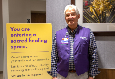Volunteers are an integral component of the CSV team. They staff the hospital’s information desks, surgical waiting room, hospitality coffee cart, and library cart. They provide support services in the emergency department and manage the clothes closet for patients in need. They escort patients and visitors throughout the hospital and support our clinics. Through the pet therapy program, (dogs only) they visit with patients, visitors and staff. They create baby blankets, holiday tray favors and other crafts. They sing and play music in patients’ rooms and waiting areas and offer spiritual care to patients.